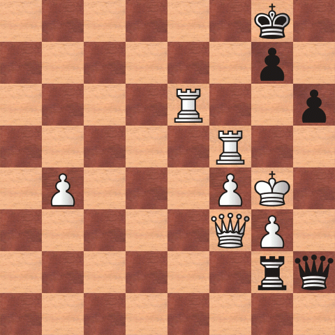 [Event "Bilbao, 2007"] [White "Judit Polgar"] [Black "Bu Xiangzhi"] [FEN "6k1/6p1/4R2p/5R2/1P3PK1/5QP1/6rq/8 w - - 1 0"] %Hidden=1 1. Rf8+ Kxf8 2. Qa8+ Kf7 3. Qe8#